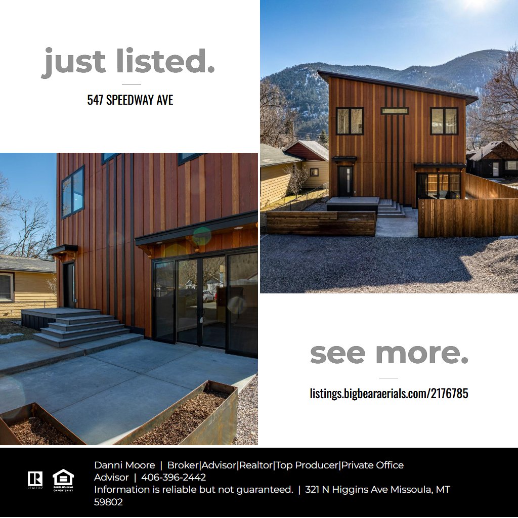 Located in the growing community of East Missoula, this newly constructed 3-bedroom, 2.5-bathroom home by Larabee Construction & Lower Crossing Builders offers modern, low-maintenance living with stunning mountain views. Step inside to clean lines, tall ceilings, and picture windows that flood the space with natural light. The stylish kitchen features stainless steel appliances, custom cabinets by local craftsman Jack Metcalf, and sliding doors leading to a spacious back deck. The living area boasts custom bookshelves and sliding doors to a patio—both perfect for enjoying the mountain views. Upstairs, you'll find three bedrooms and two bathrooms with a laundry room, including a serene primary suite with a soaking tub and a luxurious walk-in shower with multiple showerheads. The property comes with an unfinished basement which would be ideal for a den or rec room. Outside there is plenty of off street parking in addition to a two car garage. This property does come with the ability to add ADU. Here on Speedway you are a couple short minutes to the Clark Fork River, Downtown, and the University of Montana. Don't miss this exceptional home in an ideal location!